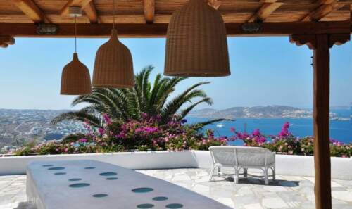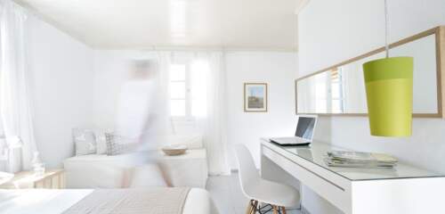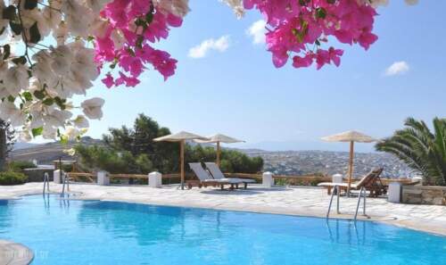 At Agnandi in Tourlos, time seems to slow down to a dream-like pace as one takes in the breathtaking blue of the Aegean sea and sky, the charming white of the town of Mykonos (Hora), ancient Delos and the splendid surrounding Cycladic islands whilst lazily counting all boats entangled in a perpetual choreography in and out of the island’s ports. Only 500 metres uphill over the new port and within an easy 5 minute car-ride from Hora, nestles Agnandi, an ideal summer get-away for a quiet and relaxing holiday. Surrounded by two and a half acres of lush garden filled with geraniums and bougainvilleas, are 18 independent residences, varying in size, that offer all the comforts of a perfectly set country home, coupled with the personalized services of a hotel. The complex’s swimming pool provides mesmerizing views together with shady pergolas for lazy sunny mornings, gold-tinted sunsets whilst the twinkling lights that sparkle at twilight invite you to the soul of the never-sleeping town. The family is discreetly on hand for any type of assistance you might require, in order to facilitate your perfect holiday. Their sole aim is to make your stay here a truly unforgettable experience. Come along with your partner, your friends or your family!