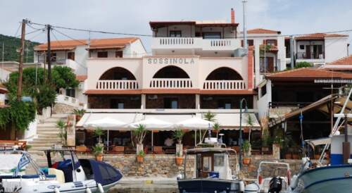 Sporades Islands. In the Sporades Islands, you will admire the unique architecture and you will explore the beauty of unspoiled nature. Undeniably, the stigma of Sossinola is that gives an aura of pleasure, brightness and freshness because of the high standards of accommodation and qualitative services offered to our guests. Sossinola is located at Steni Vala, Alonissos7005, Greece and there are so many terrific beaches around to choose from that your dilemma will be where to go first. There are also sparsely populated settlements or villages to discover that offer amazing seafood, natural aesthetic icons, beaches, monasteries and attractions, thus do not stay in just one location. Looking for a peaceful place to enjoy your holidays Sossinola is your destination! Find yourself in a green surrounding with rich pine forests, crystal blue seas and sandy beaches! Taste the famous cheese-pies and have a shot of o?zo in tav?rnas by the sea! The Sporades Islands are waiting for you to discover them!