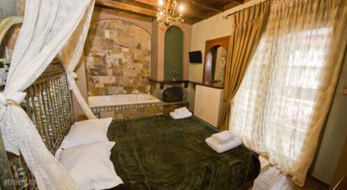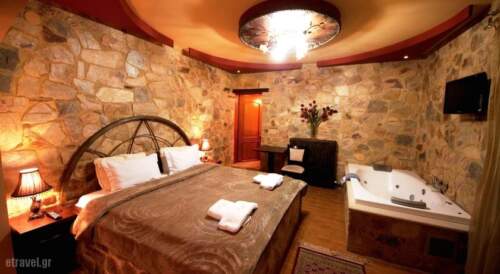 Stone- built Morfeas Guesthouse is located in Loutraki Arideas 1.2 miles from the spa town of Pozar. It features individually decorated studios with free Wi-Fi and a balcony overlooking Mount Kaimaktsalan. A TV and a kitchenette with a fridge and cooking hobs are included in all air-conditioned studios at the Morfeas. Rooms have stone walls and warm colours while some feature four-poster beds, a fireplace or a hot tub. Guests can relax with a drink or coffee in the spacious lounge room and bar that features leather armchairs and a fireplace. Ala carte breakfast can be enjoyed daily. Room service is also provided. Traditional taverns, cafe and shops are within a 3-minutes walk from the property. Kaimaktsalan Ski Centre is 18.6 miles away. The lively town of Edessa is at 20.5 miles. Free private parking is provided on site.