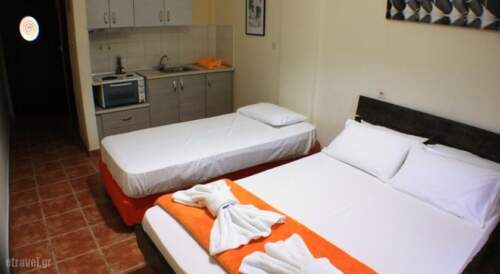 Zisios is located amongst olive trees, a 5-minutes walk from Vourvourou beach in Chalkidiki. It offers air-conditioned studios with free Wi-Fi and a balcony overlooking Mount Athos gulf. A kitchenette with fridge and cooking hobs is included in all units at the Zisios studios. Each has a TV and a private bathroom with shower. A children’s playground is provided for younger guests. BQ facilities are available in the garden. Ormos Panagias where cruise boats depart to Mount Athos is 5 miles away. The lively Nikiti village is at 6.8 miles. Free private parking is possible on site.