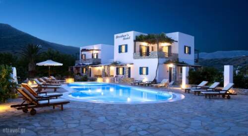All rooms are equipped with private WC and shower, air conditioning, TV and refrigerator. Also available are spacious apartments with kitchen facilities.Tourist information, maps, as well as bike and car rental services are provided at the reception. Brother’s Hotel can also arrange for excursions to other beaches.The hotel’s location just below Chora, and 650 yards from Yialos beach, provides easy access to shops, travel agents, as well as taverns, bars and gift shops.
