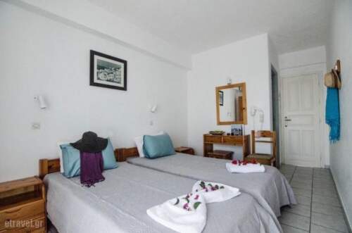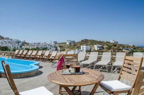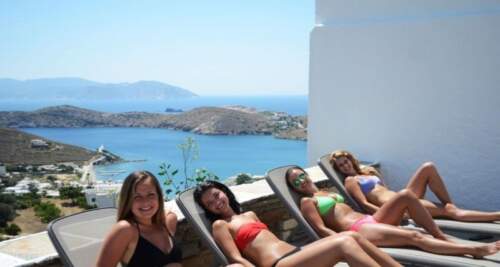 Francesco’s is the number one rated accommodation from hostelworld travelers in all of Ios plus in August 2006 was voted the sixth best hostel IN THE WORLD. And with good reason, just take a look at the sunset view from our terrace bar at your right, that’s what you could be enjoying your cocktails to each evening during your stay in Ios.An amazingly gorgeous hostel with stunning views overlooking Gialos Port. Francesco’s is a classy happening place for backpackers in the heart of party-til-dawn-Ios-Town . It is a 10 minute walk from the main beach and there are also six other beaches within comfortable walking distance. We are a family run hostel where everybody is made to feel at home and all your needs are catered to. From the time you arrive to the time you depart you become part of the Francescos family.There is an air-conditioned terrace bar with satellite television and breakfast cafe ( we even have vegemite on toast for the aussies ) which overlooks the port, beach, and one of the best sunset views on the island, as you can see in the photo. New to the hotel is our Apres Beach jacuzzi which is open in the evenings to relax and to enjoy the stunning sunset.All guests are invited for a free welcome drink and a chance to meet fellow travelers in our friendly bar to start their first night on Ios. None of our guests ever pay the cover charge at the famous Ios Blue Note, one of the most popular clubs on the island.Some of the amenities which are offered at Francesco’s include 24-hour hot water, a new reception area with internet cafe, tourist information and information on boat and plane tickets etc. , and all guests are encouraged to make use of our free safety deposit boxes. We also have an extensive travelers book exchange and no curfew or lock outs to disrupt your night or day.There are double, triple, and quad rooms available for up to 150 people. All rooms have been newly renovated. Most have private bathrooms and there are also rooms available with shared facilities. All private rooms have air conditioning, televisions and telephones. A number of rooms have private balconies with ocean views. There are also dorm beds available for solo travelers. All rooms are serviced daily as we pride ourselves on how spotlessly clean our accommodation is, we realize what a difference this makes to a guests stay.On your day of checkout we offer free left luggage and free showers if you decide to go to the beach and have an afternoon or night ferry to catch.After you make your booking with us all you have to do is either e mail or call us with your boat details and our driver Matthew will pick you up from the boat free of charge, and also drop you off when you are leaving, which is also for free.So don’t waste any time guys and girls get booking and we hope to see you during the summer. And please remember book early for July and August as this is an extremely busy period for us.Please note payment only by cash.LONELY PLANET SAYS – ‘The well run Francescos,with good clean rooms, is near the centre of things and is a lively meeting place for backpackers.The party spirit rules supreme. It has a busy bar and terrace with great views of the harbour’LETS GO SAYS – ‘The Godfather of accommodations in Ios, Francesco oversees a family of hotels. Standard rooms with private bath and air conditioning sit atop a convial terrace bar.’