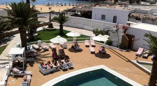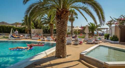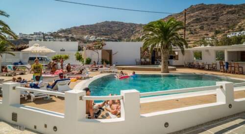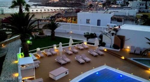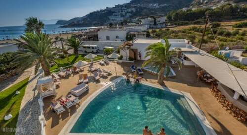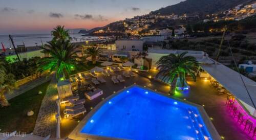 Aegeon Hotel enjoys a prime waterfront location in the centre of Mylopotas Beach in Ios.It features a swimming pool with hydromassage jets and a pool bar. Continental breakfast is served in the morning.The complex consists of 2 buildings surrounded by plants and playgrounds. The rooms are spacious and feature balconies with view. Each unit is air conditioned and equipped with satellite TV, refrigerator and coffee making facilities.Aegeon Hotel offers complimentary transfer service to and from the port and also provides guests with private parking area.Ios, well known for its nightlife, is a famous tourist destination, attracting visitors with its golden beaches and the characteristic Aegean architecture.