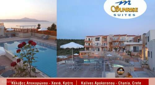 Crete. Whether your visit is for relaxation or to explore and discover the many well known and countless hidden treasures of Crete, you will not be disappointed by the diversity of the landscape, the rugged mountains, the endless beaches and the turquoise seas, the many cities, towns and villages, and stunning countryside. In Sunrise Suites you will live the essence and the heartbeat of the Island of Crete from dawn till dusk and you will certainly discover a truly memorable accommodation experience. Sunrise Suites is located at Kalyves, Chania Region, 73003, Greece and from here you can plan your next trip to discover exquisitely frescoed country chapels of the 14th and 15th centuries, ruined Minoan palaces and towns, plus top-drawer hiking and botanizing opportunities. In Sunrise Suites hospitality shares the characteristics of its famous landscape: grand, generous and infinitely welcoming. Visit Sunrise Suites and discover a wonderful island full of warmth, energy, friendly people, surrounded by legends and history. Our website: | Our Location: Kalyves, Chania Region, 73003, Greece