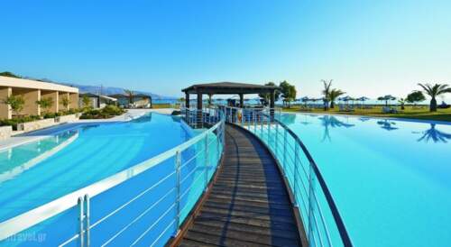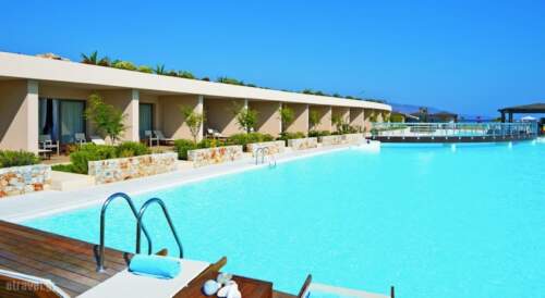 Positioned on the west side of the gulf of Chania, the newly opened hotel is built on a long stretch of beach, offering magnificent views of the gulf of Chania and the stunning Cape Spatha.guest rooms are elegantly furnished and equipped to the highest standards. The list includes 26″ flat screen satellite TV, minibar and internet connection. All that enhanced by a breathtaking sea view. The 4 restaurants offer dining options to cater everyone’s needs. At Arsenali buffet Restaurant guests can taste International or Greektastes. The sea Line beach tavern specialises in Cretan dishes. The a-la carte Azzuro focuses on Italian cuisine, while Avra Restaurant serves Eastern and Mediterranean cuisine. Greek breakfast is served daily in the dining area. Cavo Spada Luxury Sports & Leisure resort’ spa boasts an impressive pool and a children’s pool is also available. An extensive spa is at the guests disposal. Sitting 11.2 miles west of the picturesque city of Chania, the hotel’s location combines the beauty and tranquility of the Cretan Archipelagos with the charm of the Old Venetian town. Transfers by taxi can be arranged at extra charge.