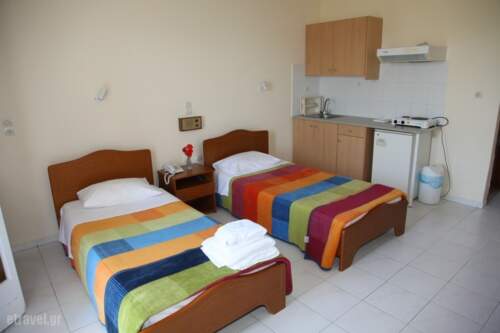 Ammousa Hotel Apartments is located in a beautiful and quiet location in Lixouri , Kefalonia, where the town meets the green fields. Because of the location, Ammousa Hotel Apartments is an ideal resting place for both couples and families looking for a relaxing vacation, while also providing you with easy access to a city and beaches with crystal clear waters. Many organized beaches with gorgeous turquoise waters of the Ionian Sea as Petani, Platia Ammos, Agia Eleni, Xi, Lepeda, and Vatsa are close to the Ammousa Hotel Apartments. You can also visit archaeological sites, world-renowned and generally all the attractions of the municipality of Kefalonia. The hotel operates the whole year under the auspices of the EOT. Studios (25 sqm) are ideal for two persons and the Apartments (35 sqm) can accommodate from 3 to 4 people. In each case you can ask for an extra bed. All rooms are equipped with TV, air-conditioning, small fully equipped kitchenette, fridge and private balcony. Free Wi- Fi and free private parking are available.