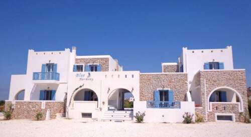 Cyclades Islands. Whats your idea of the perfect beach? Green-blue water and white sand? Beach bars and water sports? Framed by rocks for snorkelling and scuba diving?A secret Aegean cove accessible only on foot or by boat? No matter what your ideal is, youll find plenty of choices in the Cyclades. Known for the iconic blues and whites of their villages and their stunning beaches, the Cycladic islands equally deserve worldwide renown for what their crystalline waters and cove studded shoreline offer to sea lovers. Blue Harmony apartments specializes in a local treat with an aroma of the Aegean. Located at Plaka beach, Naxos4300, Greece, Blue Harmony apartments will make you believe that it has come out of the foam of waves and looks like a white painting on a blue font. Blue Harmony apartments is ideal for a relaxed and serene holiday. Because of Blue Harmony apartments location visitors can easily explore impressively fertile valleys, lush green gorges, stunning seascapes and traditional villages perched high on mountain tops, where the inhabitants still wear their traditional dress and live off the fruits of the land! Blue Harmony apartments is the place where Greek tradition and hospitality come to a harmonious marriage.