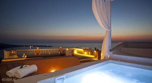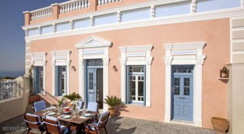 Located on the highest point of Oia vilalge with panoramic views over the caldera and the Aegean sea, Oia Mansion is a 1870 property registered as a cultural heritage building. It consists of 4 bedrooms, a large fully equipped kitchen and 3 bathrooms, 2 of which are en suite. There is also a living room, a dining room with antique table and the “Sea-Captain’s office”. It opens out to a terrace with unobstructed views of the sunset and the caldera featuring also a hot tub with sun beds. You will also find a spacious, pebbled-paved yard and a furnished sky lighted internal yard. Other services include pick up from Oia?s post office, concierge personalized service and full breakfast. The property can also arrange cooking lessons and wine tasting, shuttle service, scuba diving, yoga lessons and massage sessions.