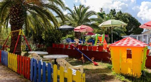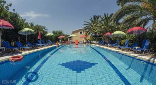Eleni Family apartments situated in northern Corfu, is a complex of self catered studios and apartmentssurrounded by palm and pine trees, only 450 meters from the quiet beach of St John in Sidari. The warm and comfortable studios and apartments of Eleni have a fully equipped kitchenette and bathroom. Air conditioning, TV and a fridge are available. The swimming pool located in the middle of the complex’s beautifully accompanied by a flower garden and reclining chairs to lie under the shade of the trees. The complex also includes an outdoor BBQ located by the garden, a children’s playground and pool slides. Car and bicycle rental services are provided. Eleni is only 200 meters from the central street that allows easy access to a variety of beautiful beaches. 1,000 meters away lies the famous Canal d’Amour beach. 2.5 kilometres away is the exotic beach of Logga with the unique sunset and the splendid view of the Ionian islands.
