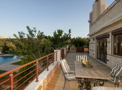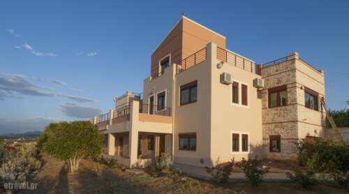 Villa Georgia located 4km west of the city of Rethymno area violin Haraki. It is built on land 4.075 sqm.The gardens around the villa is configured with various ornamental plants and trees. In the eastern part of the garden there are some with olive trees and a small vineyard. East of the villa there is a swimming pool 55sqm (1.40 depth) as well as a children’s swimming pool 8.5sqm (0,70 depth). The villa was built in 2009 and consists of three levels basement, ground floor and 430sqm in total. The ground floor is 160 sqm and consists of open plan living room, dining area, separate kitchen, two bedrooms and two bathrooms. Also on the ground floor is an energy which is connected with the underfloor heating the ground floor and the floor. North and East of the ground floor there are terraces 80 sqm in total with unobstructed views. The floor is 84,50 sqm and consists of an entrance hall, two bedrooms, two bathrooms and two large terraces of 45 sqm.