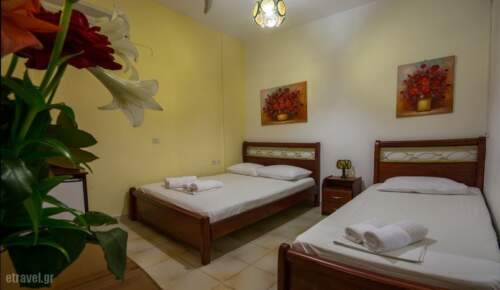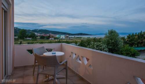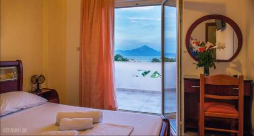 In one of the most beautiful summer destinations of Greece, Halkidiki, and in a place with beautiful beaches (5km) and seas, Sarti, you can find Stefani Hotel. A small family run hotel just a hundred meters from the sea which consists of Double, Triple and Family rooms, all with sea view. You can take your breakfast in a beautiful landscape, but also for lunch and dinner you can taste traditional food and snacks in the tavern of the hotel. The hotel provides a pool and an organised beach with umbrellas and sun beds available for hotel guests. During your stay at the beach you can enjoy your coffee or your drink, as well as a snack. A small mini market in the hotel premises gives you the ability to obtain everyday necessities without having to leave the hotel.Double Room for rent by the sea in Halkidiki Sithonia Sarti. Enjoy your holidays by the sea with direct access to the beach and the lush garden. Sarti, Sithonia, ideal for a relaxing family holiday. The best for a peaceful and relaxing holiday.
